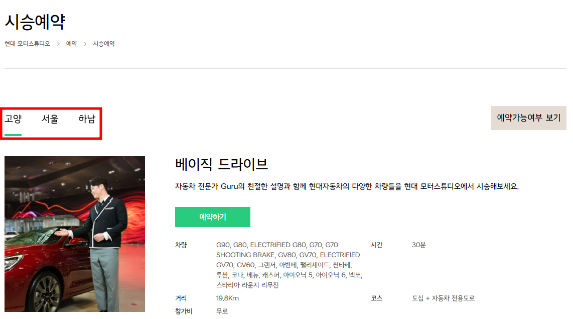 원하는 차종 예약이 가능한 카테고리에 있는 예약하기 버튼을 누르면 됩니다. 예를 들어 GV80을 시승하고 싶다면 고양 / 베이직 드라이브 카테고리에서 예약하기 버튼을 누르시고 진행하시면 됩니다.